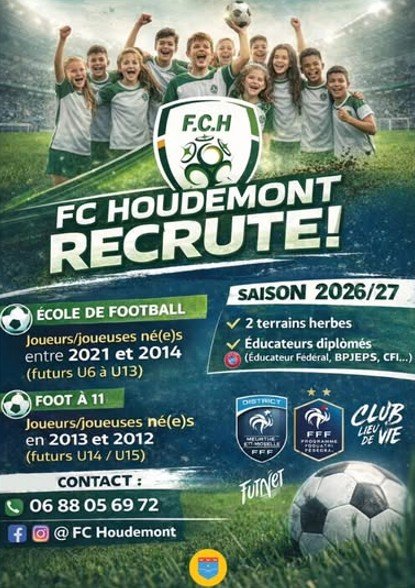 Le FC Houdemont recrute des joueurs et joueuses né(e)s entre 2021 et 2014 pour intégrer les catégories U6 à U13, ainsi que des joueurs et joueuses né(e)s en 2013 et 2012 pour les catégories U14 et U15.