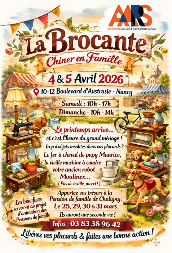 La Brocante les 4 et 5 avril 2026 au 10-12 boulevard d'Australie à Nancy, organisée par l'Association Accueil & Reinsertio Sociale.