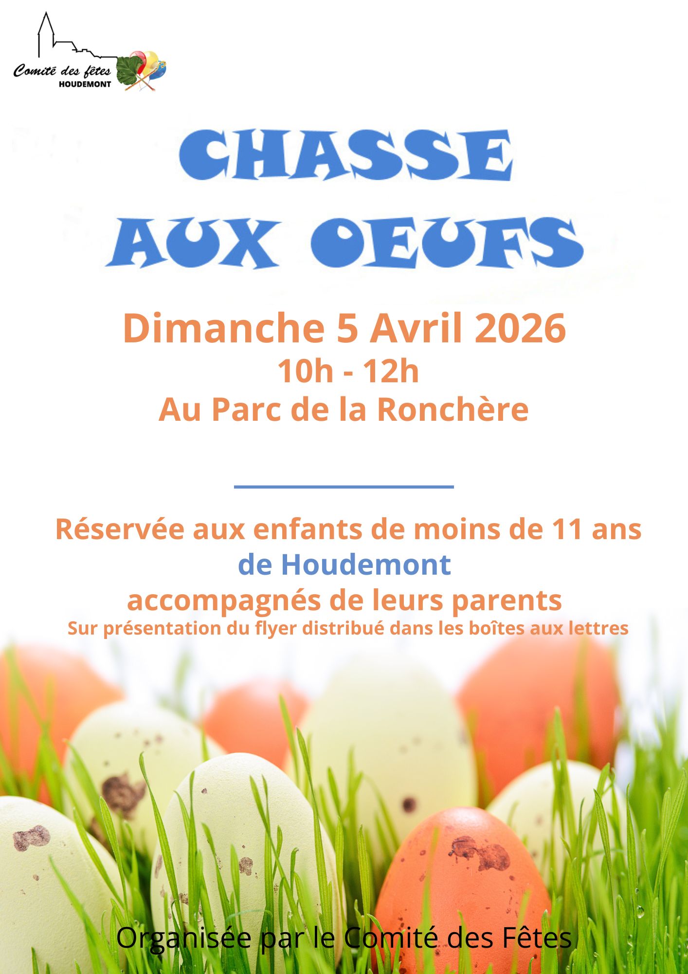 Chasse aux œufs le dimanche 5 avril 2026 de 10h00 à 12h00 au parc de la Ronchère, organisée par le Comité des Fêtes de Houdemont.