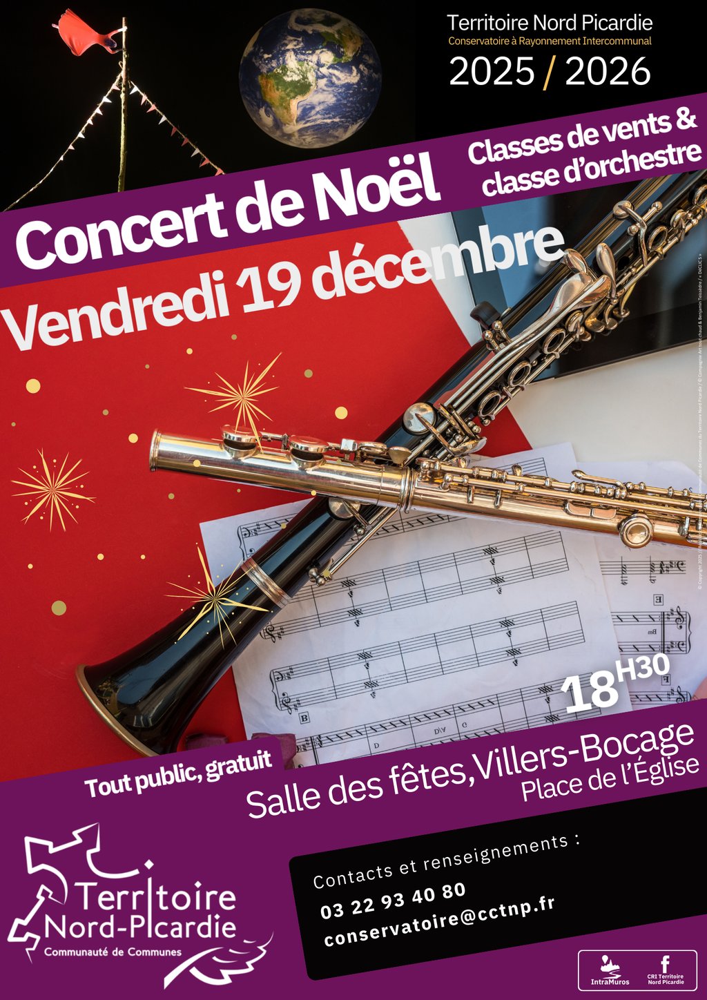 Vendredi19 décembre, à 18h30, à la salle des fêtes de Villers-Bocage, venez assister au concert de Noël des élèves des classes de vents et d'orchestre du CRI.