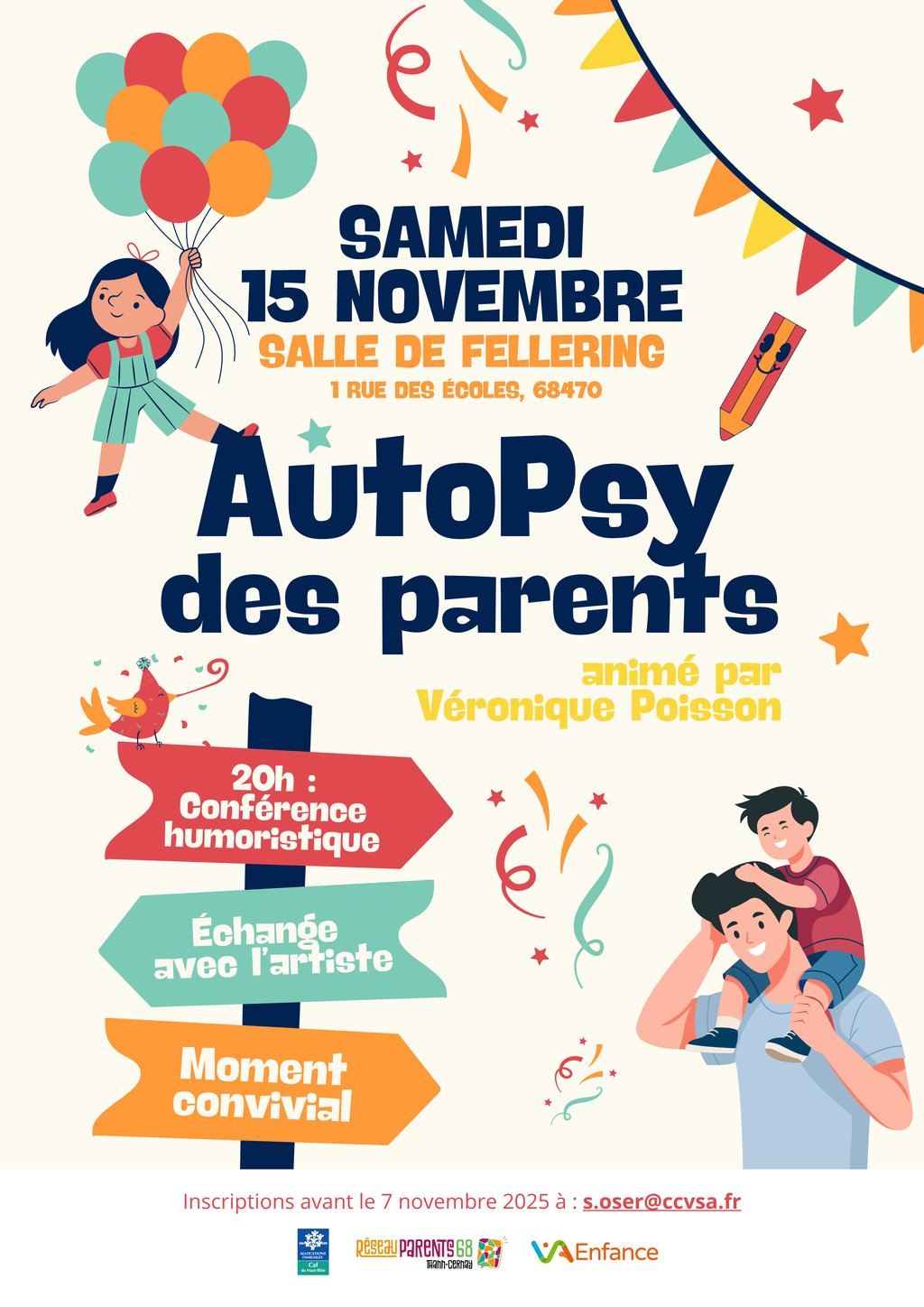 Le service enfance de la CommunautĂ© de Communes de la VallĂ©e de Saint-Amarin invite les parents, grands-parents, professionnels de lâenfance et curieux Ă une confĂ©rence humoristique inĂ©dite intitulĂ©e « AutoPsy des parents », animĂ©e par VĂ©ronique Poisson, confĂ©renciĂšre et psychopĂ©dagogue.