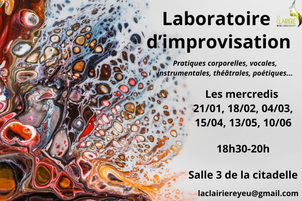 C'est un endroit où l'on peut se retrouver pour partager un espace de pratiques d'improvisation corporelles, vocales, instrumentales, poétiques, théâtrales bref créatives ! C'est un espace collectif de pratique, de recherche et de création. Cet espace permet à la fois une pratique individuelle et de relation. Nous naviguerons entre ces deux eaux là à chaque instant.
