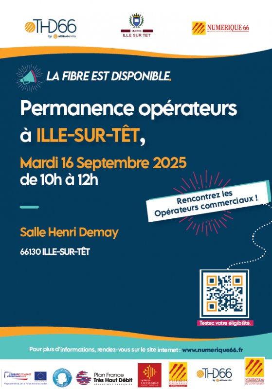 ☎️ Venez échanger sur la fibre et poser toutes vos questions aux équipes de THD66 et aux opérateurs commerciaux le mardi 16 septembre. Le réseau téléphonique traditionnel est sur le point de disparaitre, celui-ci est remplacé par le nouveau réseau public de fibre optique qui dessert déjà notre commune. 🛜