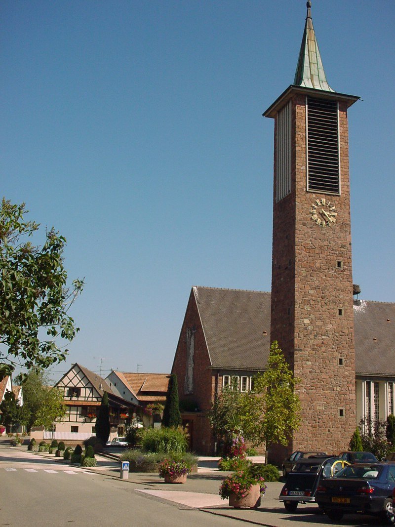 Le 1er édifice religieux d’Illhaeusern est une chapelle construite aux frais de la commune en 1728.La 2e église construite en 1861, est remplacée en 1958 par l’actuelle église, bel exemple d’art religieux contemporain. Le clocher est surmonté, non pas d’un traditionnel coq, mais d’un poisson en fer forgé rappelant que le village a été fondé par des pêcheurs et des bateliers. De la même manière, le porte-cierge processionnel de la corporation des pêcheurs et bateliers (« Fischerstange ») exposé dans le chœur de l’église fait référence aux fondateurs du village.Les vitraux modernes aux tons rouges et orangés situés dans la nef symbolisent des grands faits de l’histoire du peuple de Dieu (Agneau pascal, pain et vie, arche de Noé, colombes, …) ; ceux situés dans le chœur, de couleur bleue, rappellent de façon allégorique les sept sacrements de l’Église (baptême, mariage…). Cet ensemble de vitraux non figuratif apporte à l’église un jeu de lumière exceptionnel.Après les vitraux, le regard se porte sur le retable, constitué de neuf planches d’échafaudages espacées formant un carré de 3,5 m de côté. Ce retable, représentant une Crucifixion, a été réalisé par Christoff Baron qui a constitué son œuvre en s’inspirant des traces laissées sur les planches par le maçon ou le peintre.Les fonts baptismaux conservés dans le collatéral nord, derniers vestiges de la chapelle de 1728, comportent des sculptures en feuilles d’acanthe, notamment aux angles du pied en balustre et à la base du bassin.