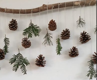 Viens créer une décoration de Noël avec du bois, ficelle, rubans, pommes de pin