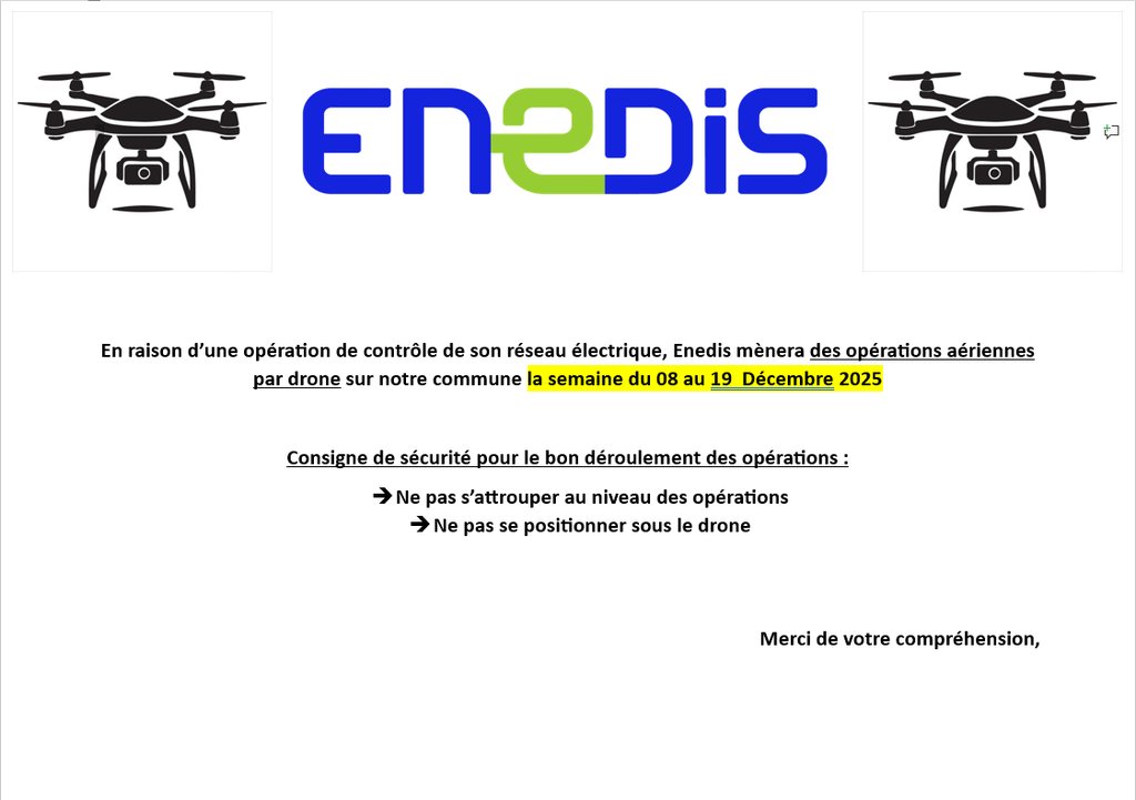 En raison d’une opération de contrôle de son réseau électrique, Enedis mènera des opérations aériennes par drone sur notre commune les semaines du 08 au 19 décembre 2025.