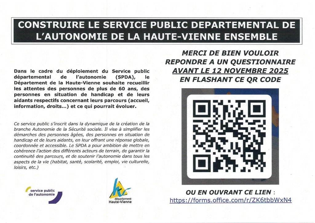 Dans le cadre du déploiement du SPDA, le Département de la Haute-Vienne souhaite recueillir les attentes des personnes de plus de 60 ans, des personnes en situation de handicap de leurs aidants respectifs concernant leur parcours (accueil, information, droits...) et ce qui pourrait évoluer.