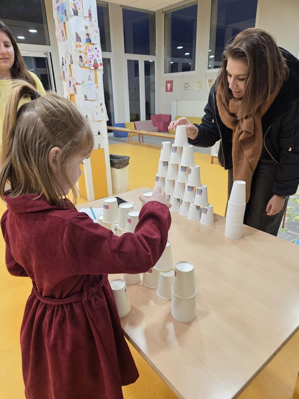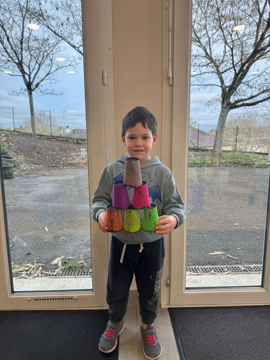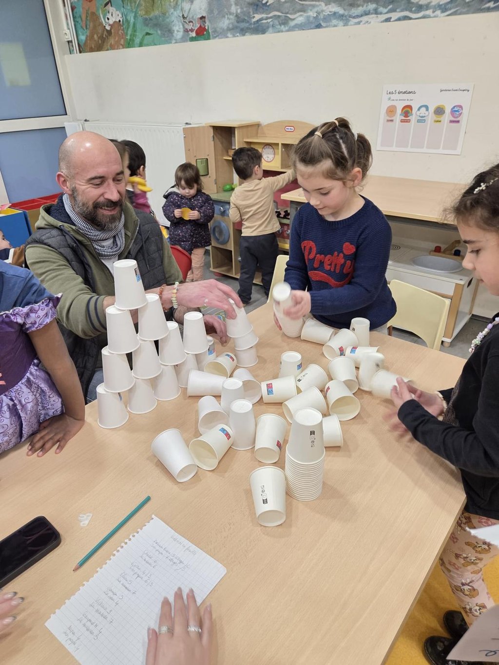 Les 23 enfants présents ont pu, avec leur famille faire le défi de construire la plus haute pyramide. De nombreux duels amusants se sont déroulés entre fratries ou avec les parents. Le gagnant est Thomas avec 7 étages, suivi de Valentin et Charlie avec 6 étages.