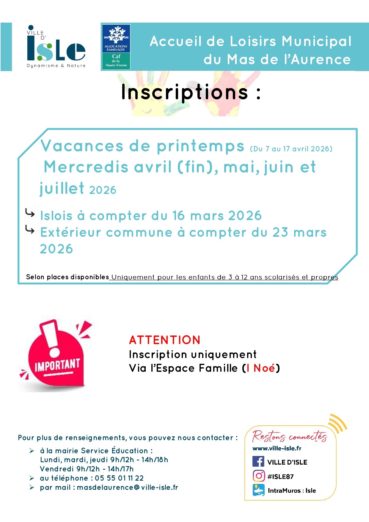 INSCRIPTIONS ALSH AVRIL ET MERCREDIS DE MAI À JUILLET