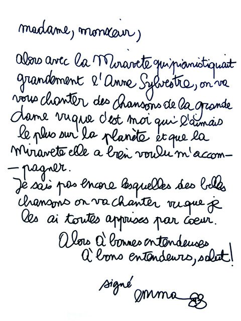 Emma s’empare des chansons d’Anne Sylvestre, car comme elle le dit au public, c’est elle qui l’aime le plus au monde et en plus elle les a toutes apprises par cœur (les 250). Elle a demandé à Nathalie Miravette qui fut la pianiste d’Anne pendant 11 ans si elle voulait bien l’accompagner (bénévolement), et elle a accepté, sans savoir à qui elle avait à faire.