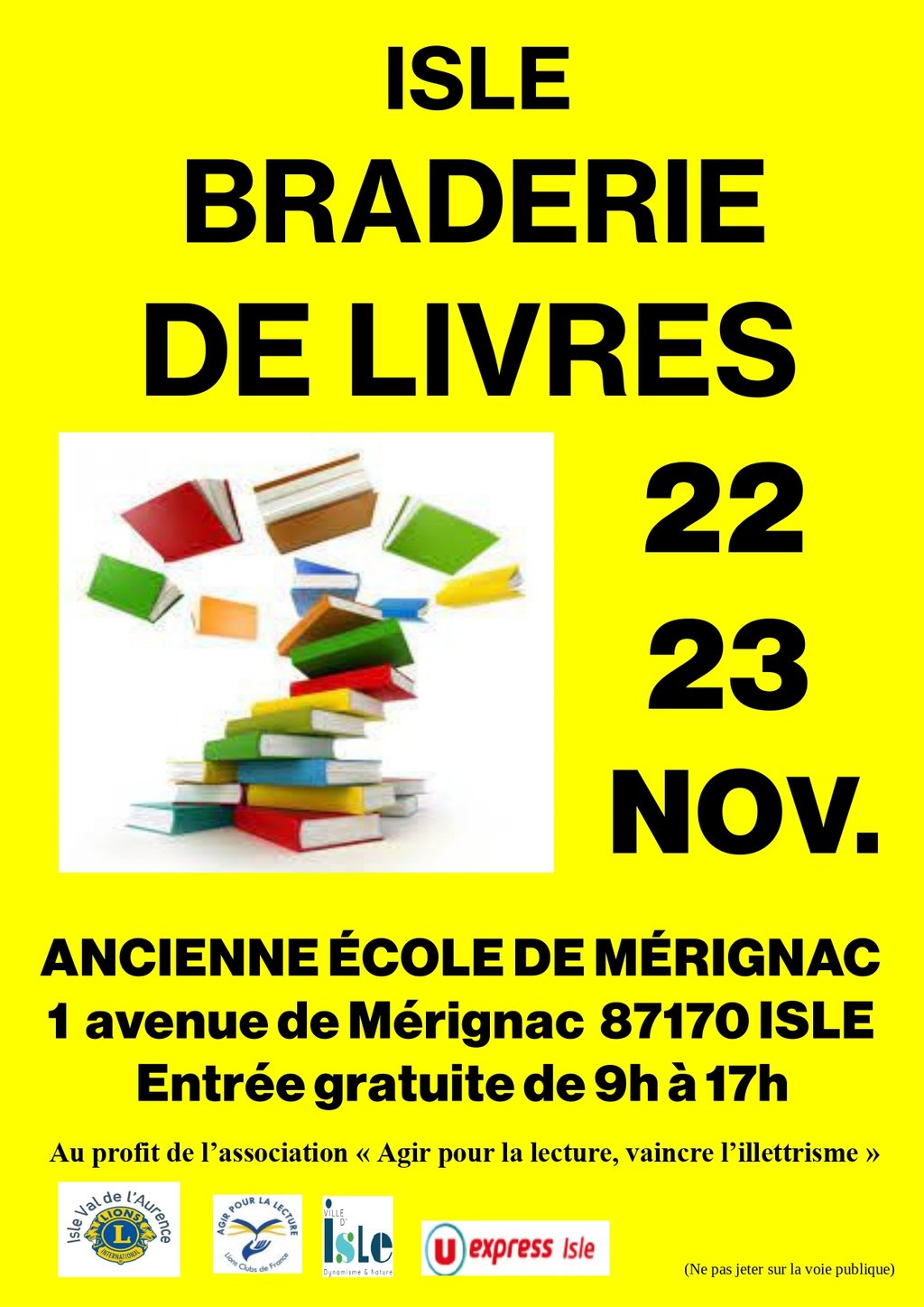 Le lions Club Isle Val de l'Aurence organise une Braderie de Livres le 22 et 23 novembre 2025 à l'Ancienne Ecole de Mérignac à Isle, de 9h00 à 17h00, l'entrée est gratuite et un tarif étudiant pratiqué.