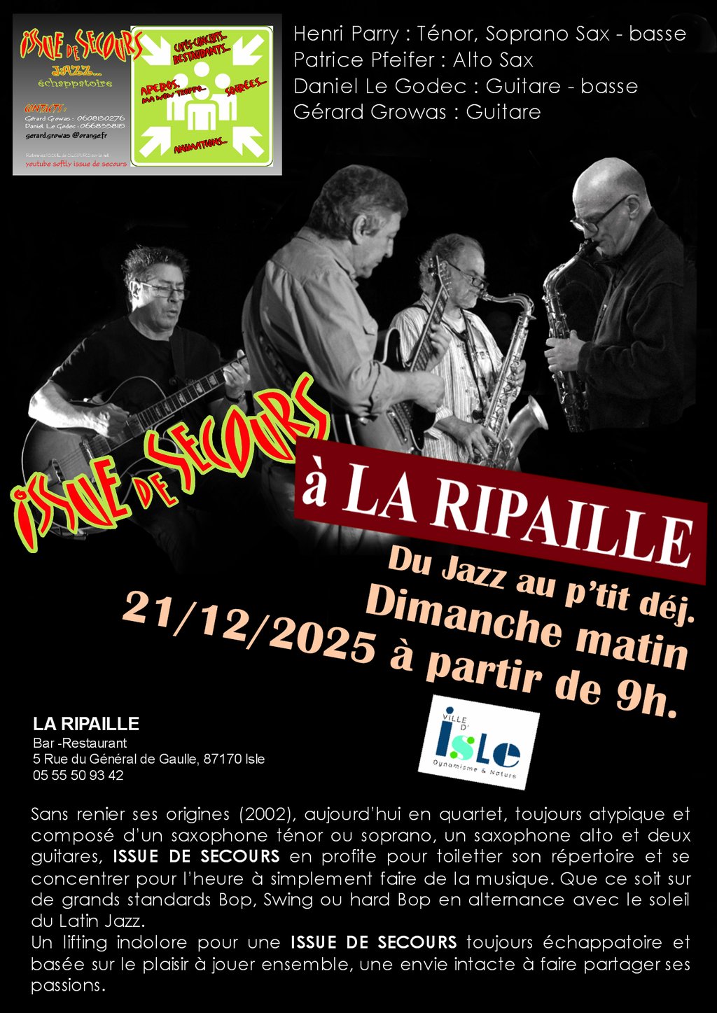 Venez découvrir ou re découvrir le répertoire du groupe « Issue de Secours », quartet composé d’un saxophone, deux guitares et une contrebasse, tout en prenant votre petit déjeuner.
