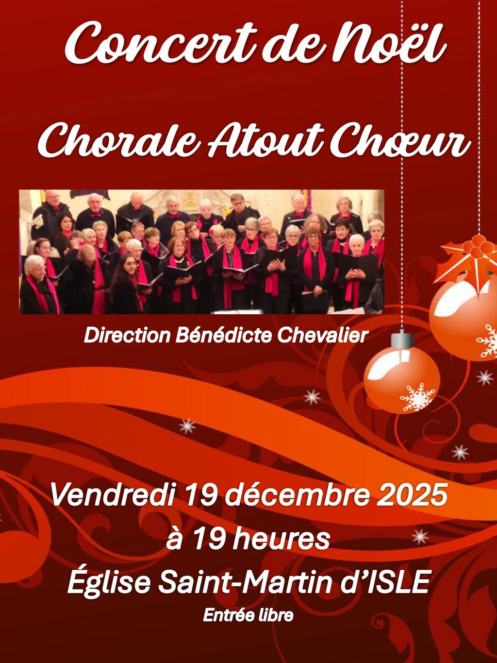 La chorale Atout chœur donnera son concert de Noël vendredi 19 décembre à 19 heures en l’église Saint Martin d’Isle.