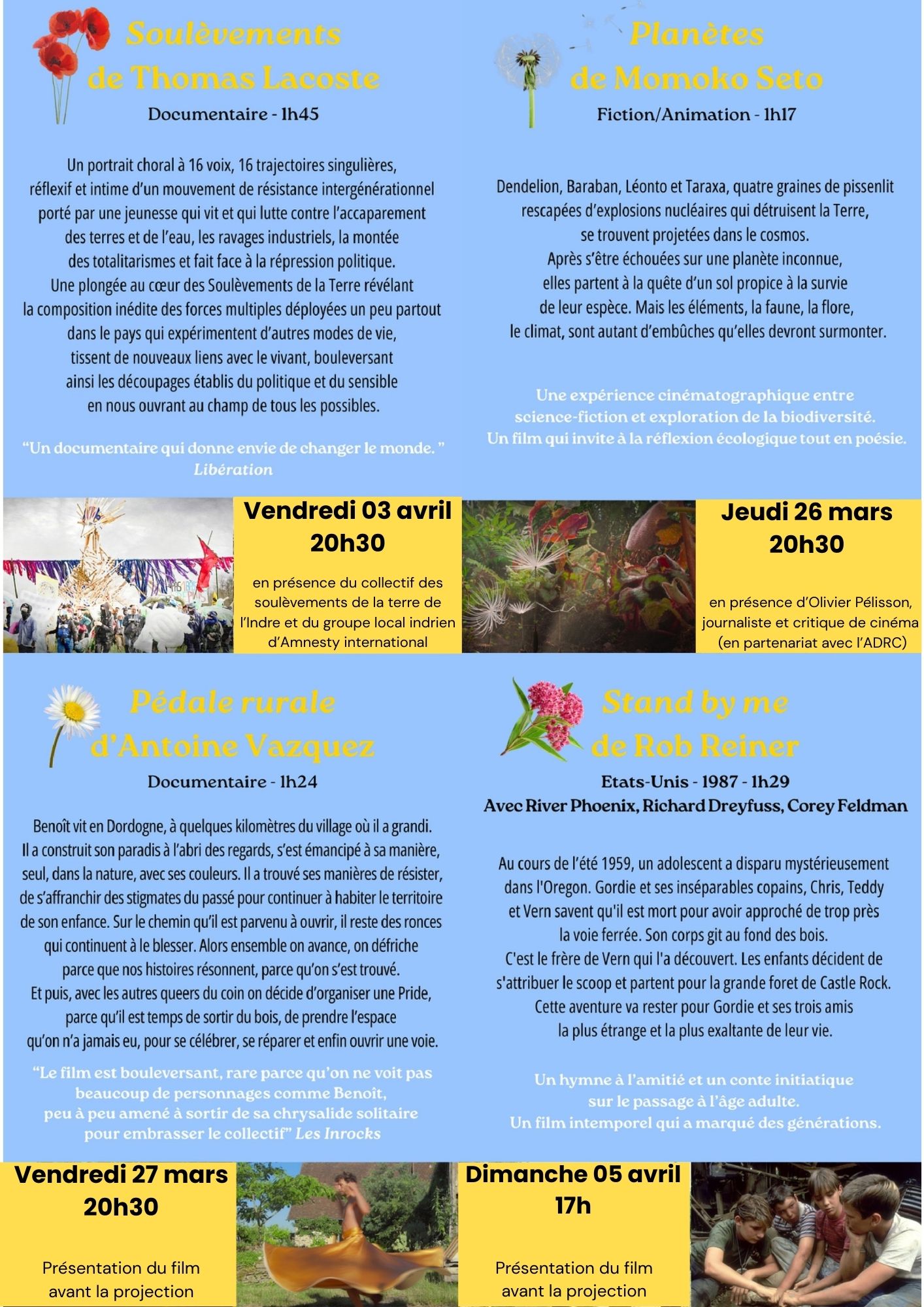 - Vendredi 3 avril à 20h30, le documentaire Soulèvements de Thomas Lacoste avec l’intervention du collectif des Soulèvements de la Terre de l’Indre et du groupe local indrien d’Amnesty International