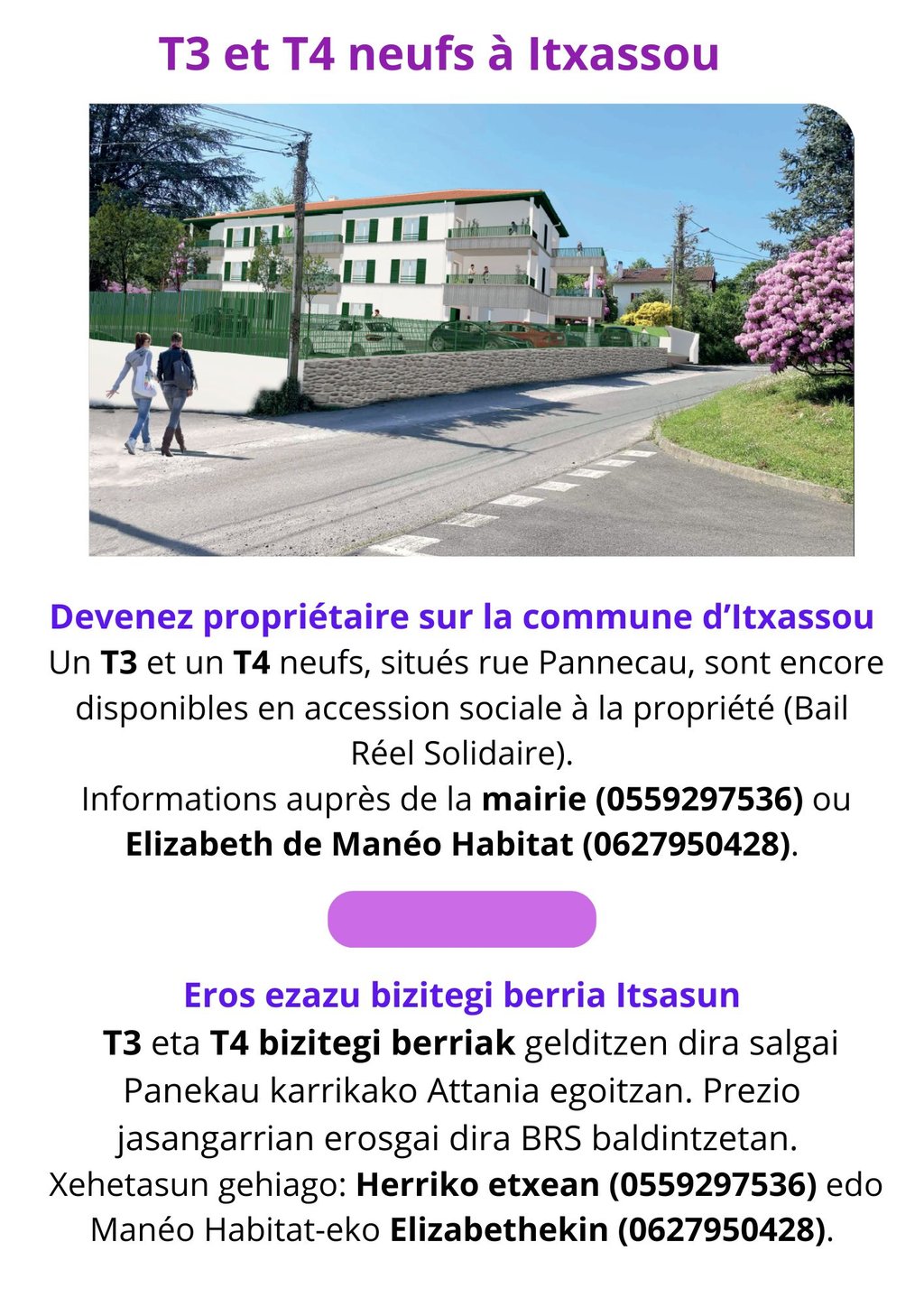 T3 eta T4 bizitegi berriak gelditzen dira salgai Panekau karrikako Attania egoitzan. Prezio jasangarrian erosgai dira BRS baldintzetan. Xehetasun gehiago: Herriko etxean (0559297536) edo Manéo Habitat-eko Elizabethekin (0627950428).