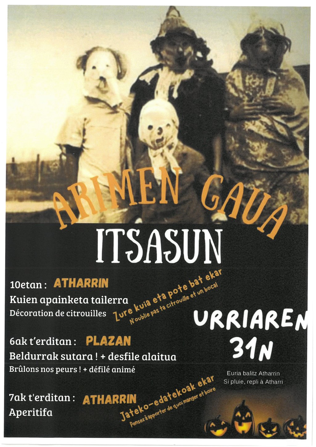 Urriaren 31an ostiralez: 10'etan Atharrin kuien apainketa tailerra. 18'30tan Desfilea Plazatik Atharrirat, Itsasuko 3 eskoletako haurrek bertsu, kantu eta dantzak emanen dituzte. 19'30etan Atharrin Aperitifa partekatua (bakotxak jateko eta edateko ekartzen du eta denek elgarrekin partikatuko dugu gau goxo bat pasatzeko).