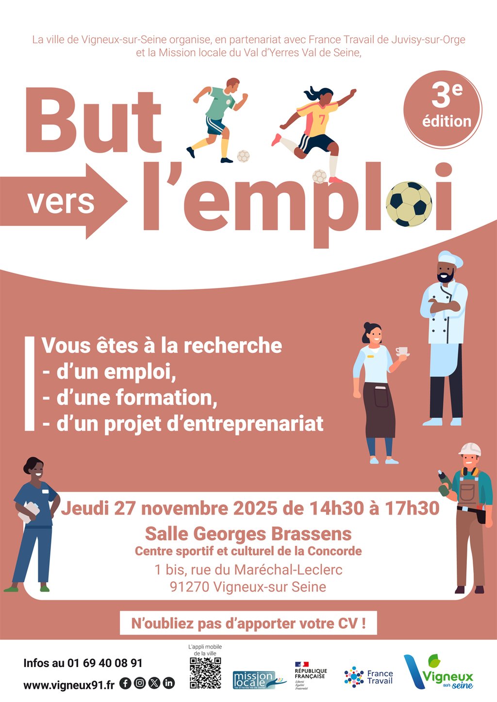 • le 27 novembre, de 14h30 à 17h30 au salon France Travail, qui se tiendra dans le complexe sportif Georges Brassens de Vigneux-sur-Seine.