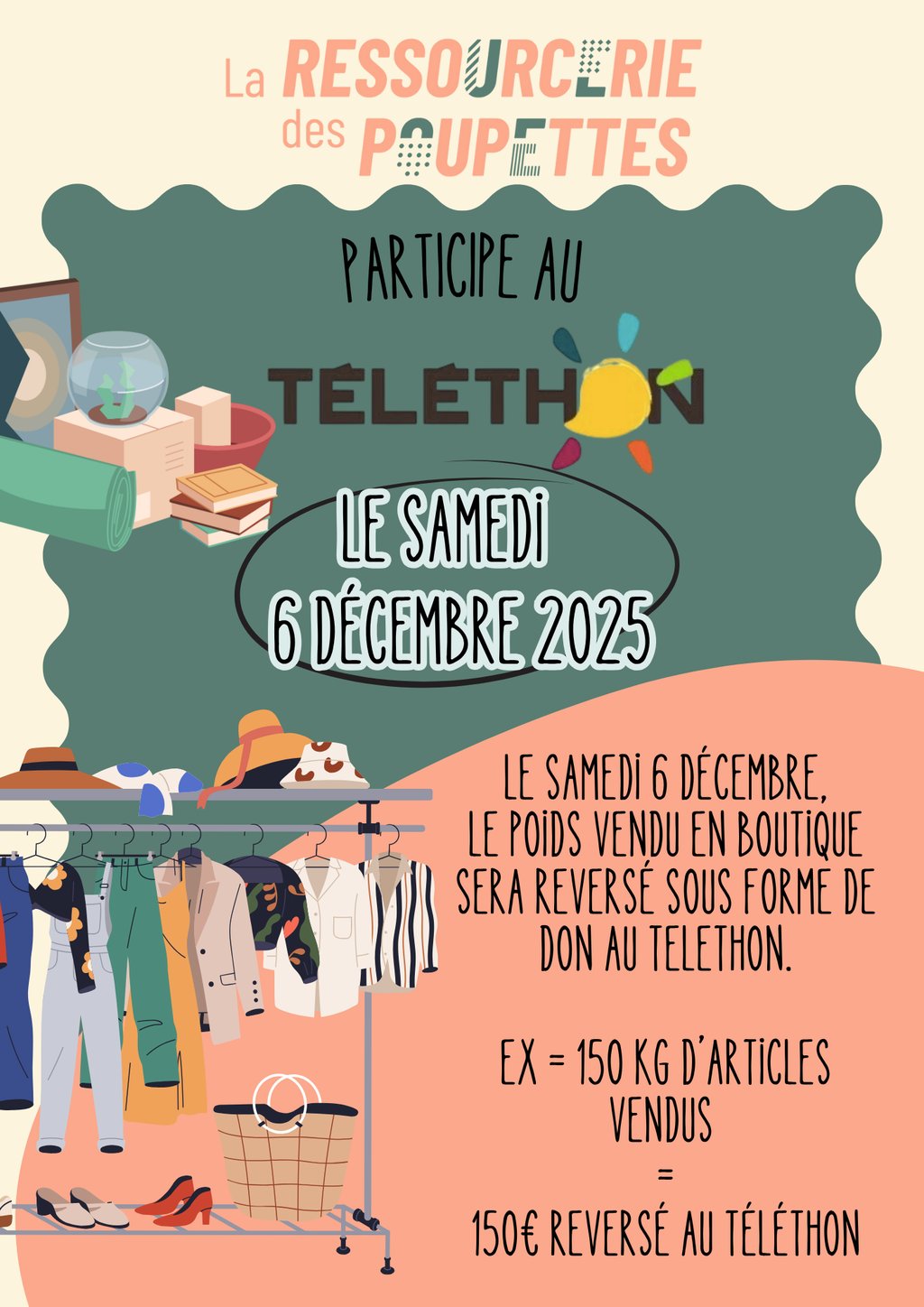 Par ailleurs, La RESSOURCERIE des POUPETTES s’associera au TÉLÉTHON 2025 : l’intégralité du poids revendu en boutique lors de la journée du samedi 5 décembre sera reversée sous forme de don.