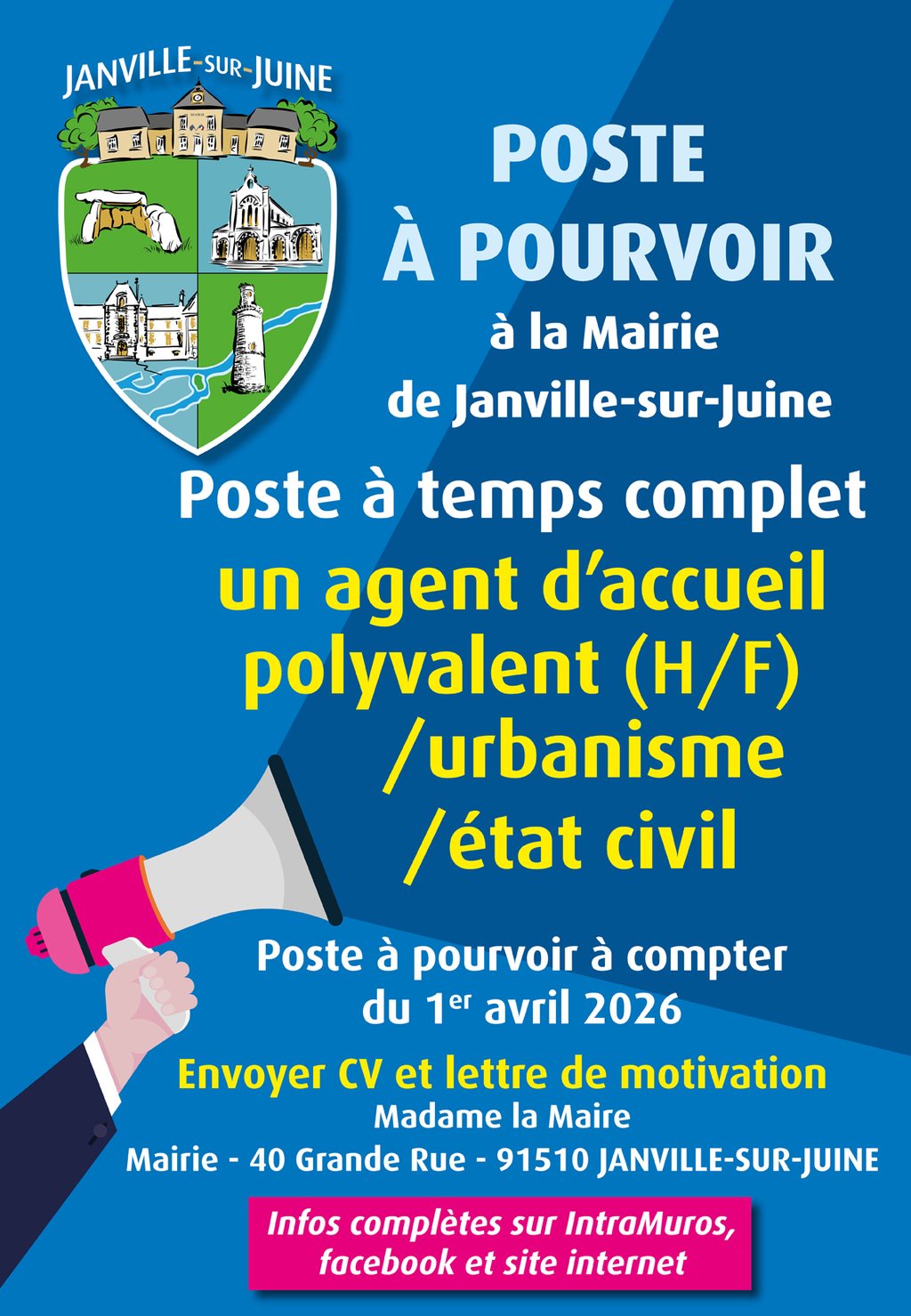 La commune de Janville-sur-Juine recherche un agent d’accueil polyvalent / urbanisme / état civil