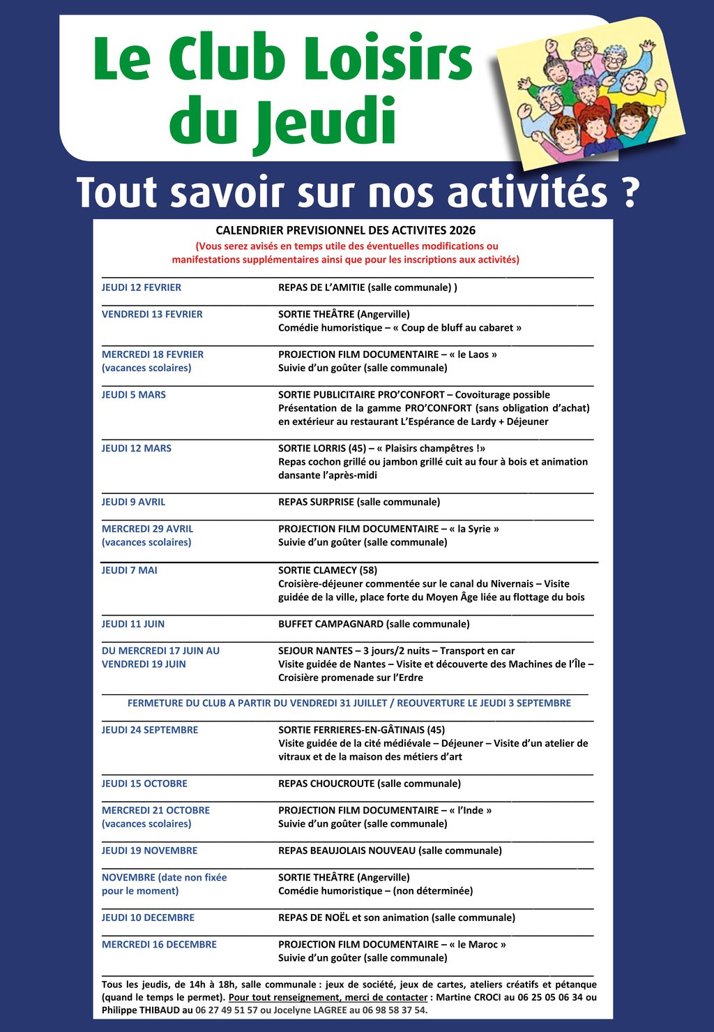 Retrouvez le programme complet des activités du Club Loisirs du Jeudi.