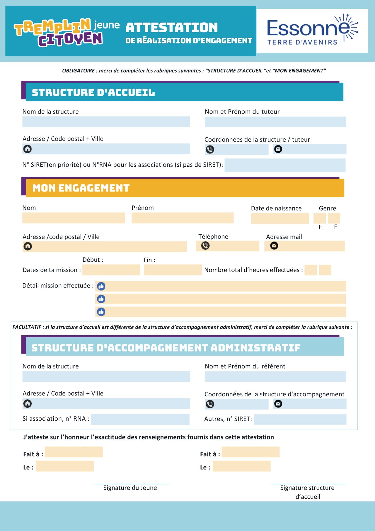L'attestation de mission : Le formulaire à remplir par votre association pour valider l'engagement du jeune. Nous vous rappelons que l'indication du numéro SIRET (en priorité) ou RNA de votre structure est obligatoire sur ce document. ICI