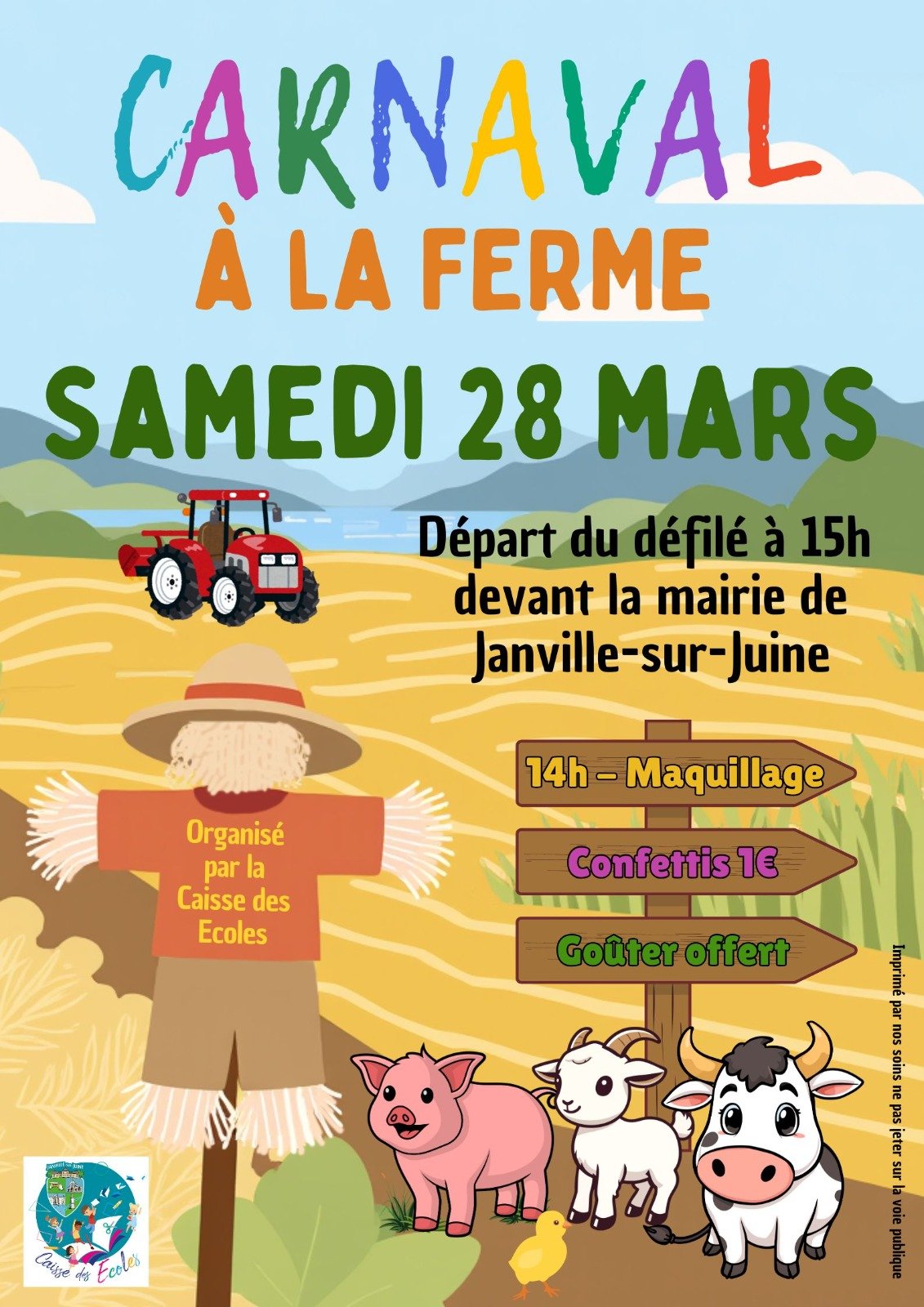 Le carnaval "A la ferme" organisé par La Caisse des Ecoles aura lieu le samedi 28 mars à partir de la 15h, départ devant la mairie