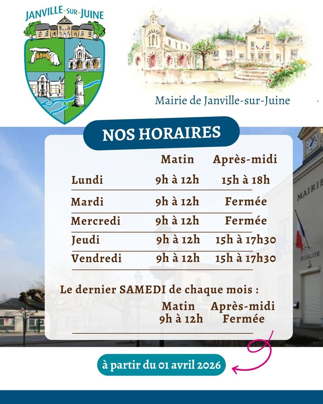 À compter du 1er avril 2026, la mairie sera désormais ouverte uniquement le dernier samedi de chaque mois, de 9h à 12h.