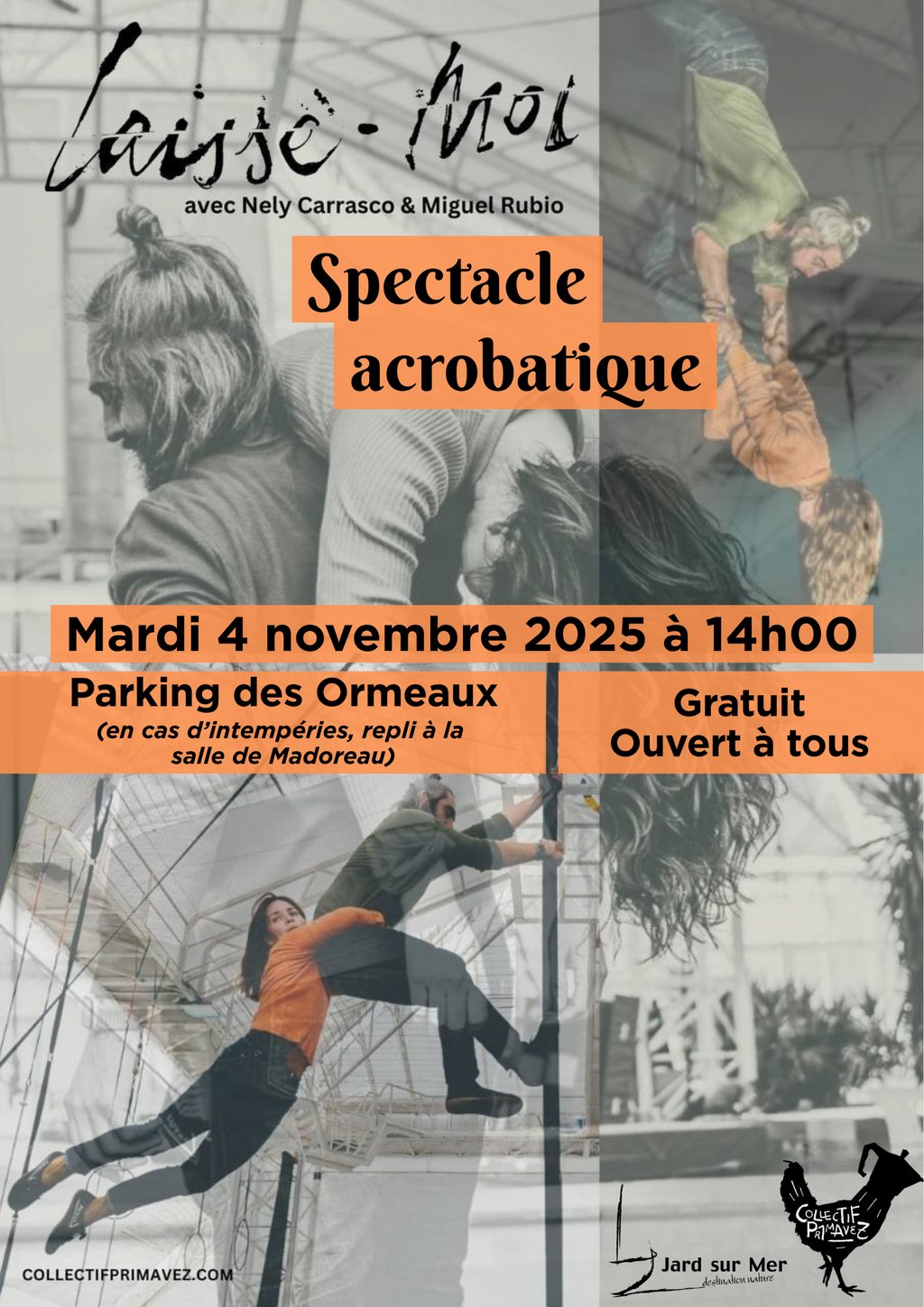 Une représentation gratuite de leur spectacle acrobatique Laisse-moi sera proposée au public le mardi 4 novembre à 14h00, sur le parking des Ormeaux. En cas d’intempéries, le spectacle se tiendra au complexe sportif de Madoreau.