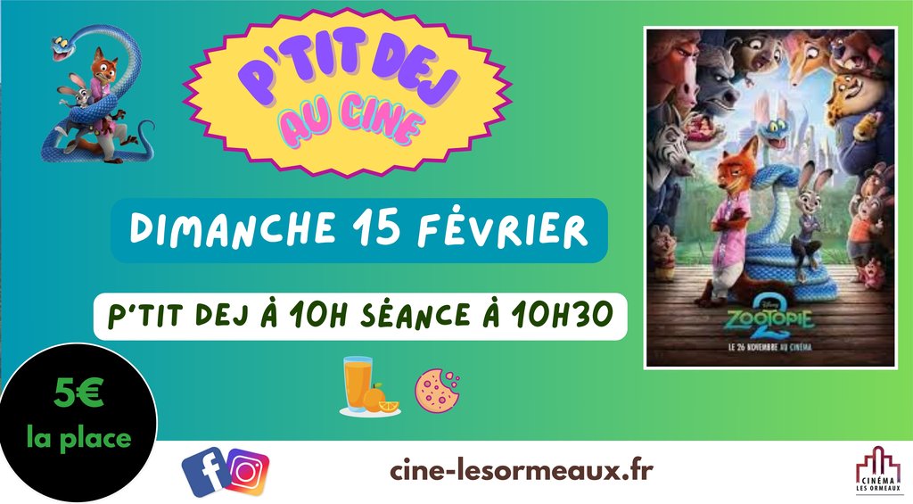 Venez participer à notre séance CINÉ P’TIT DÉJ avec la projection du film d’animation ZOOTOPIE 2, le dimanche 15 février.