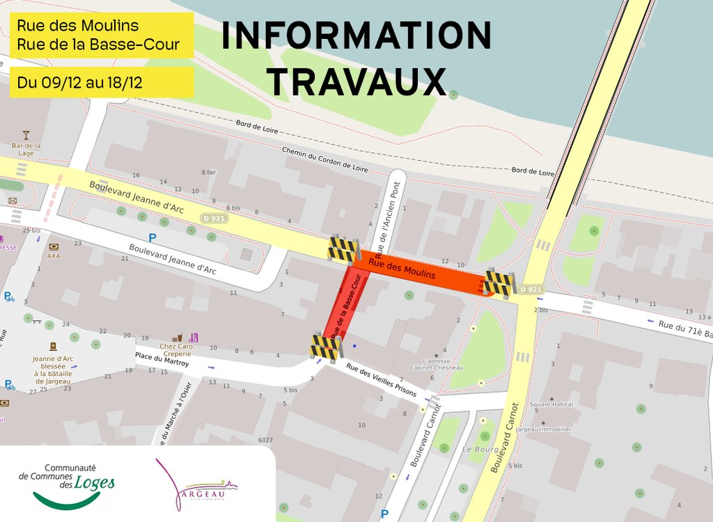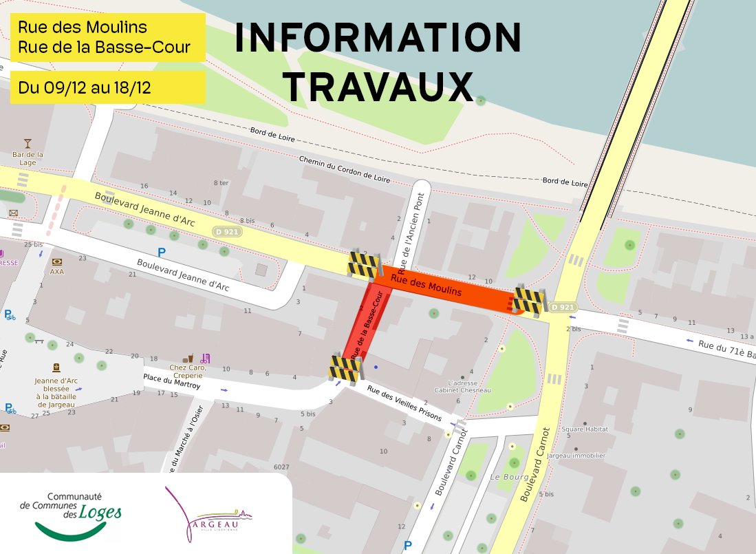 Les travaux de reconstruction du centre de santé de Jargeau, réalisés par la Communauté de communes des Loges, sont actuellement en cours rue des Moulins et rue de la Basse-Cour. Pour des raisons de sécurité, la circulation doit être totalement interrompue.