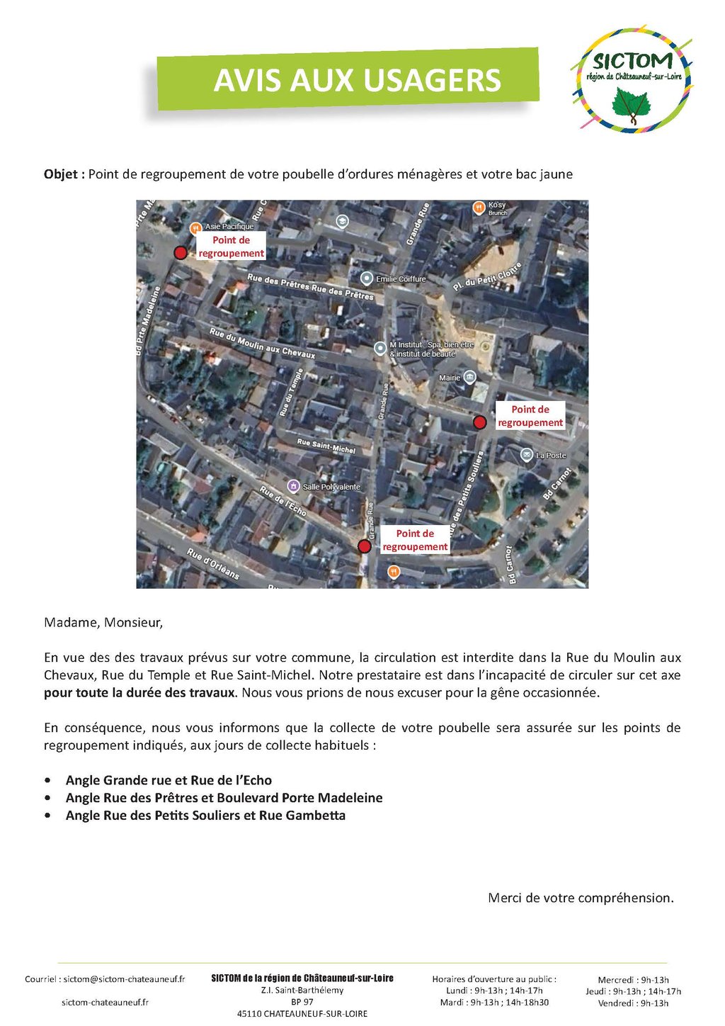 Les habitants des rues concernées par les travaux en cours ( rues du moulin aux chevaux, du temple et Saint Michel) auront une collecte regroupée à :