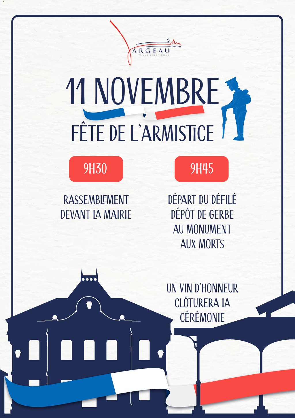 Rassemblons-nous à 9h30 devant la mairie pour un départ du défilé à 9h45 en direction du monument aux morts.