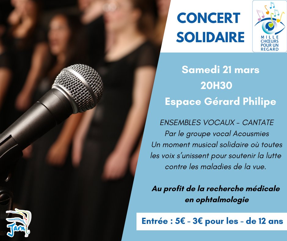 Le 21 mars à l’Espace Gérard Philipe, un concert est organisé au profit de la recherche médicale en ophtalmologie par Mille Chœurs pour un Regard. 🎤 Venez profiter d’un moment musical porté par des ensembles vocaux, où toutes les voix s’unissent pour soutenir la lutte contre les maladies de la vue. 🎶👁️