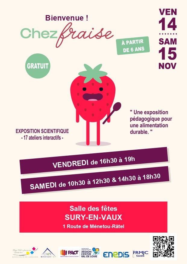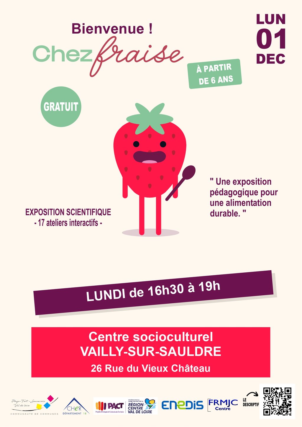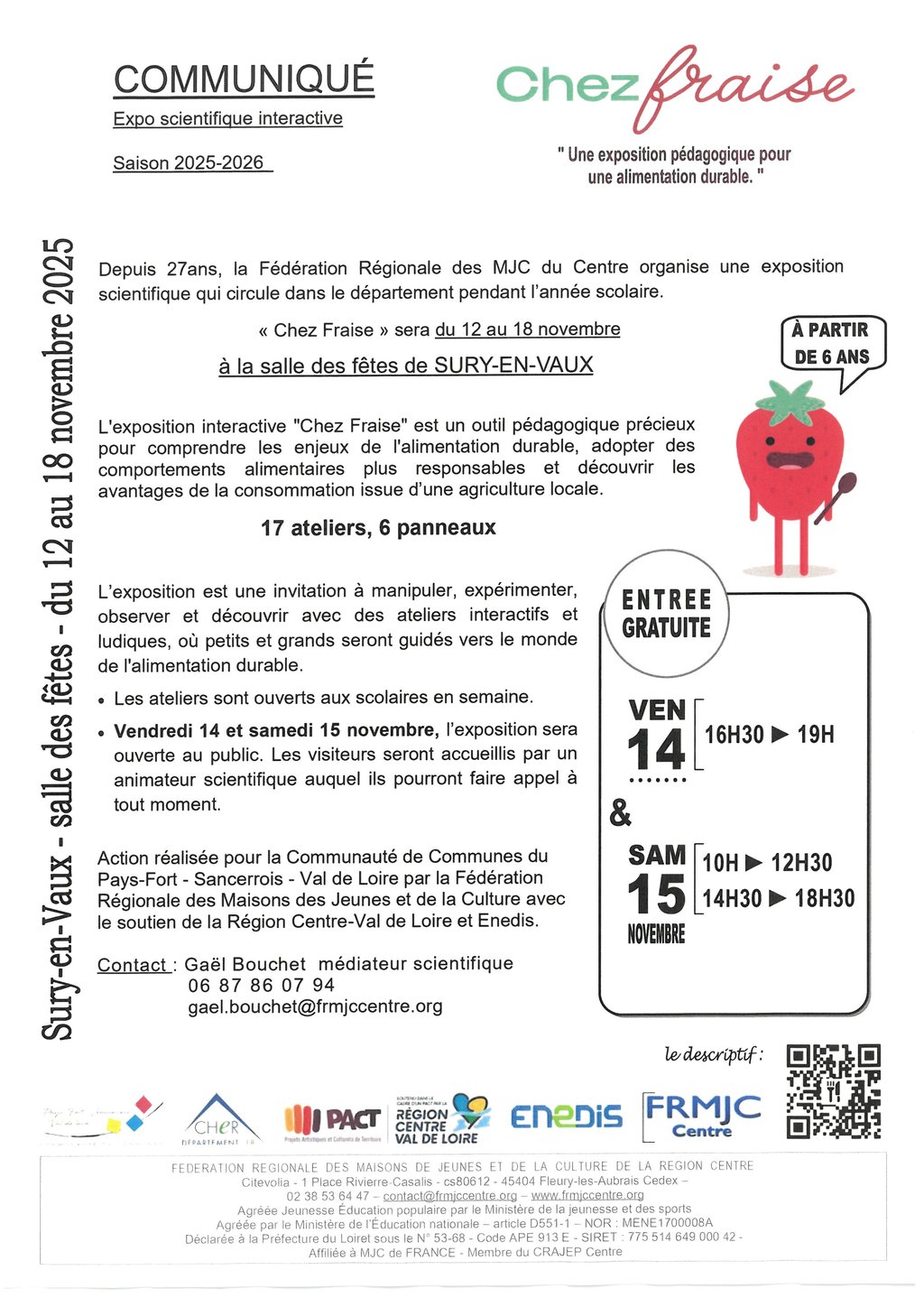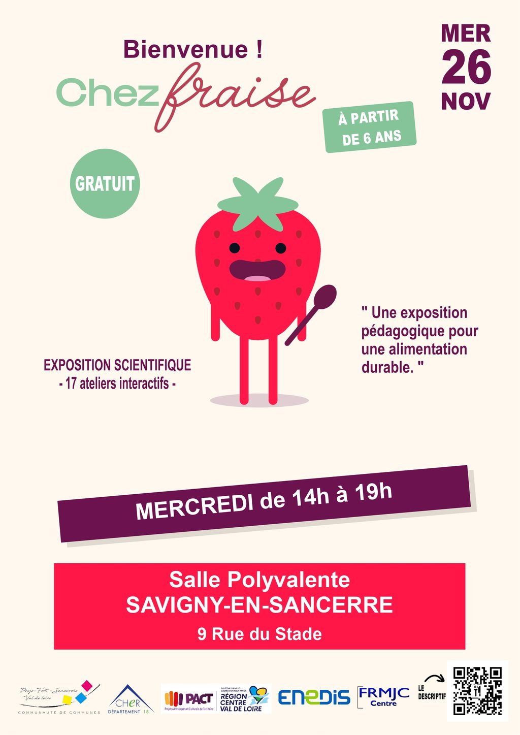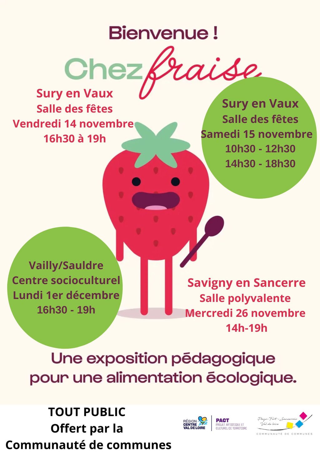 Dans le cadre de la saison culturelle la FRMJC Centre propose une exposition scientifique « Chez Fraise » financée par la Communauté de communes qui sera ouverte au public dans les communes de Sury en Vaux les 14 et 15 novembre, Savigny en Sancerre le 26 novembre et Vailly le 1er décembre.