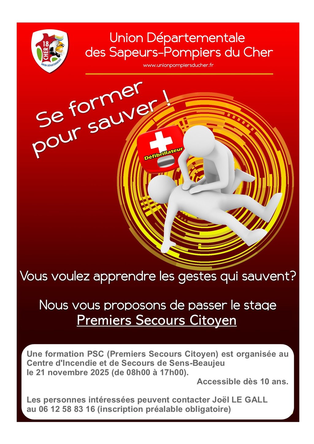 organisation d'un PSC (Premiers Secours Citoyen) au Centre de Secours de Sens Beaujeu le vendredi 21 novembre 2025.