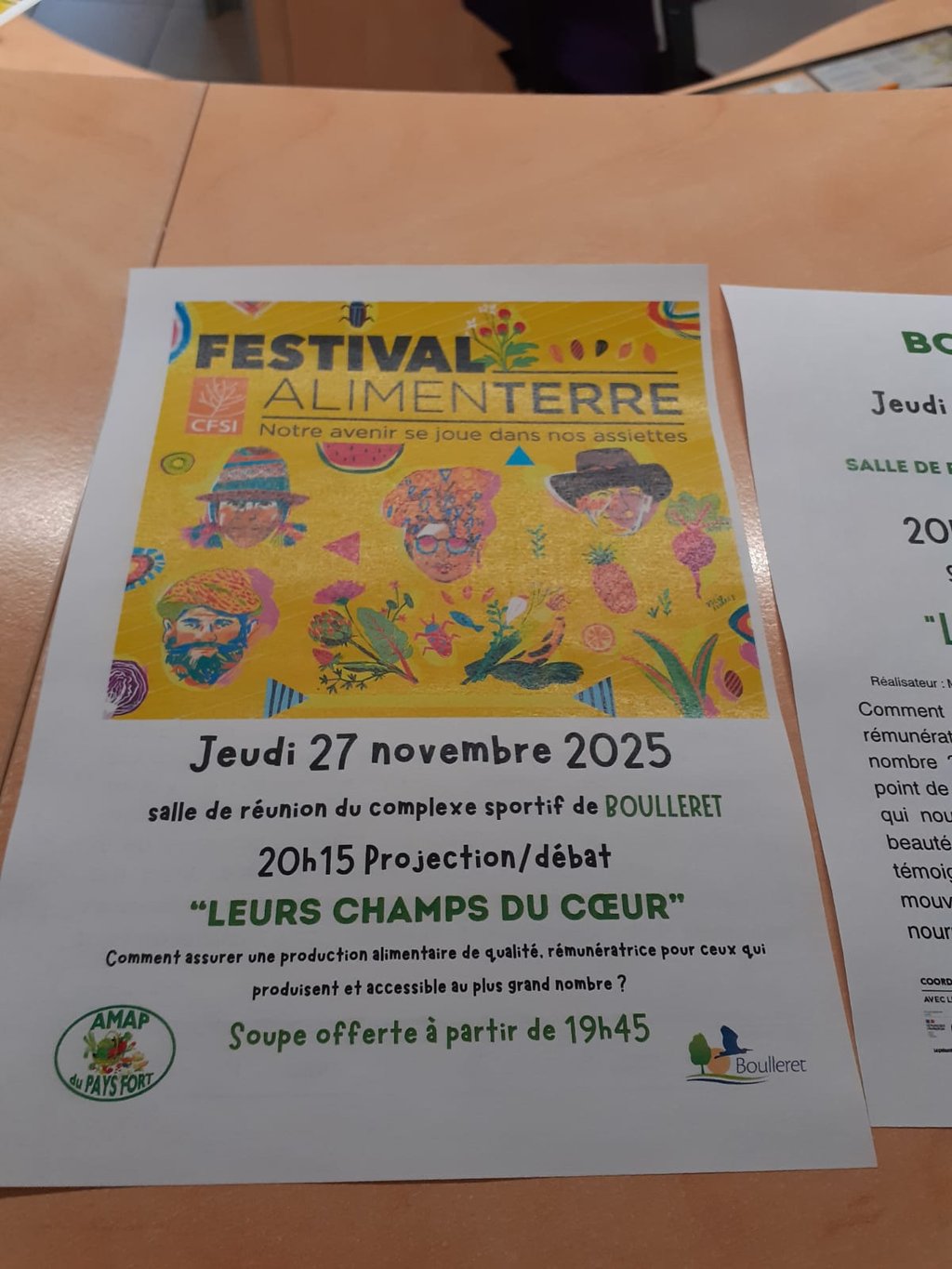 L' AMAP du Pays Fort , en partenariat avec l' Association HFLS d 'une part et la municipalité de Boulleret d 'autre part vous propose 2 projections gratuites pour évoquer le lien entre Alimentation et santé, l'impact de nos choix de consommation , le revenu des paysans .