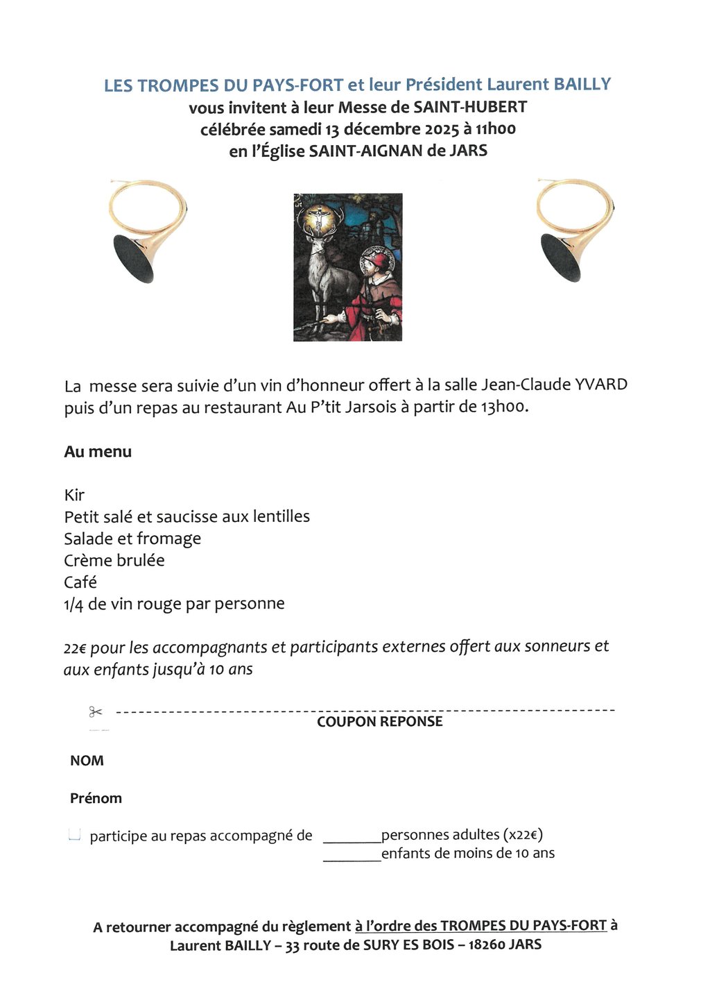 LES TROMPES DU PAYS-FORT ET LEUR PRÉSIDENT LAURENT BAILLY, SONT HEUREUX DE VOUS INVITER À HONORER SAINT-HUBERT
