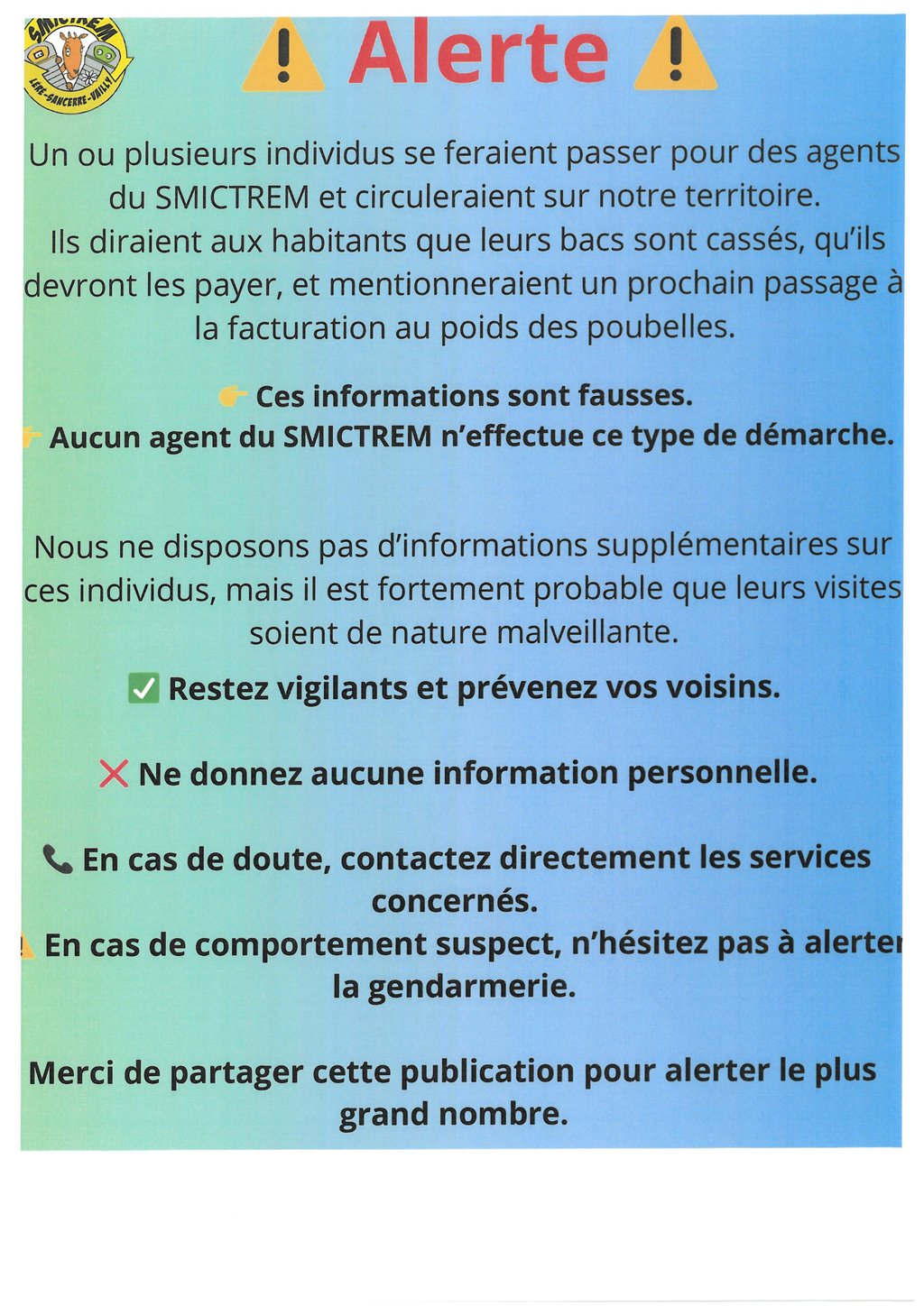 Nous souhaitons vous informer qu’un ou plusieurs individus se feraient passer pour des agents du SMICTREM et circuleraient actuellement sur notre territoire.