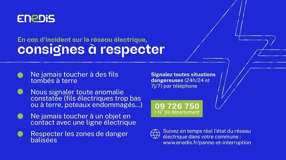 Pour rappel, ne jamais toucher des fils tombés à terre ou tout objet en contact avec une ligne électrique. Protéger la zone si possible et contacter les services dépannage en urgence.