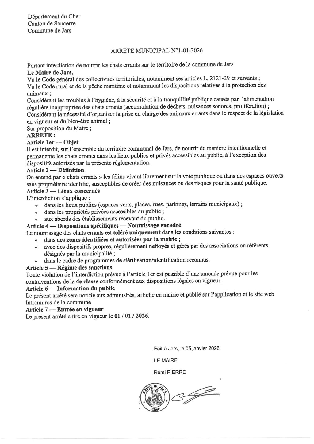 ARRÊTÉ INTERDISANT LE NOURRISSAGE DES CHATS ERRANTS DANS LA COMMUNE DE JARS