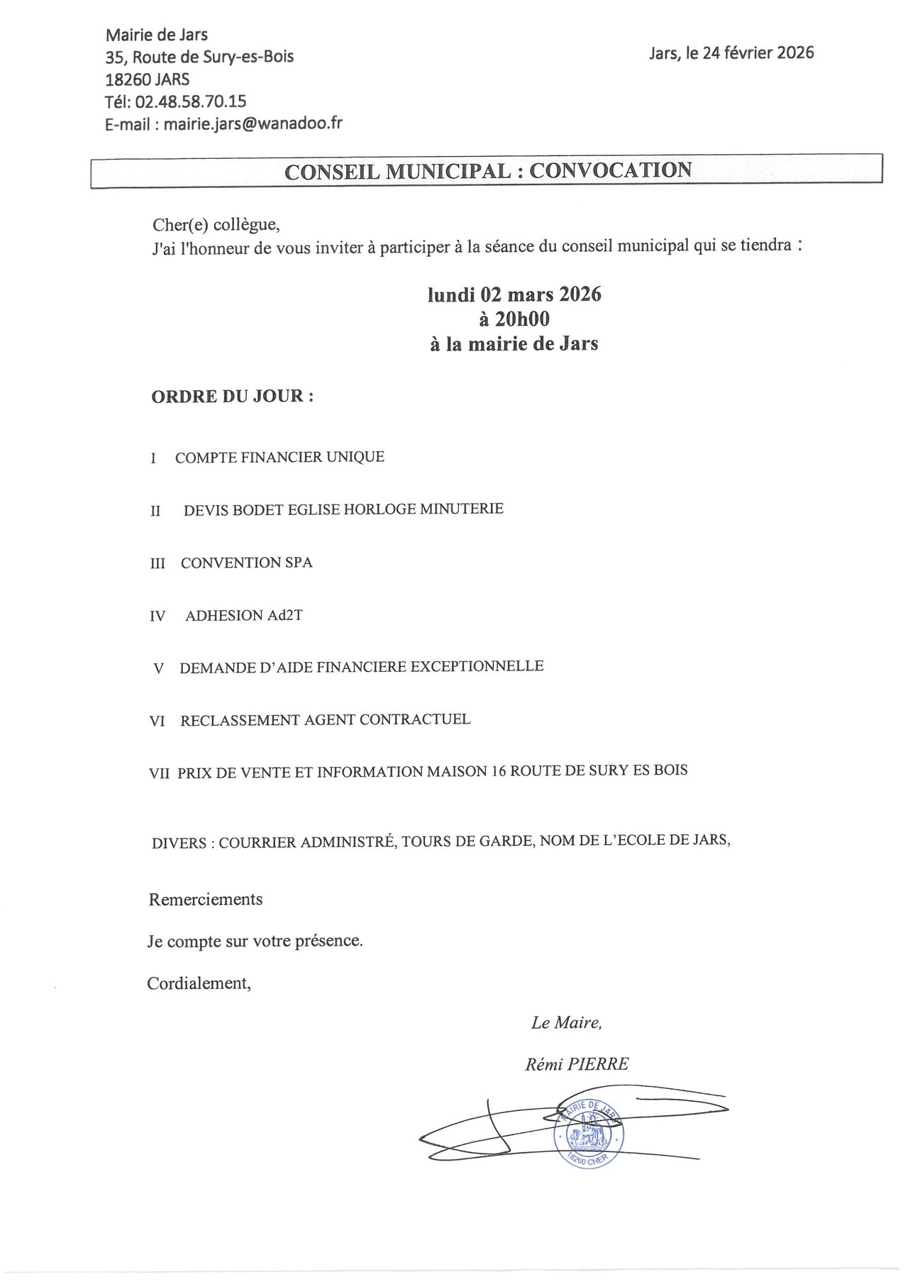 CONVOCATION CONSEIL MUNICIPAL DU 02 MARS 2026