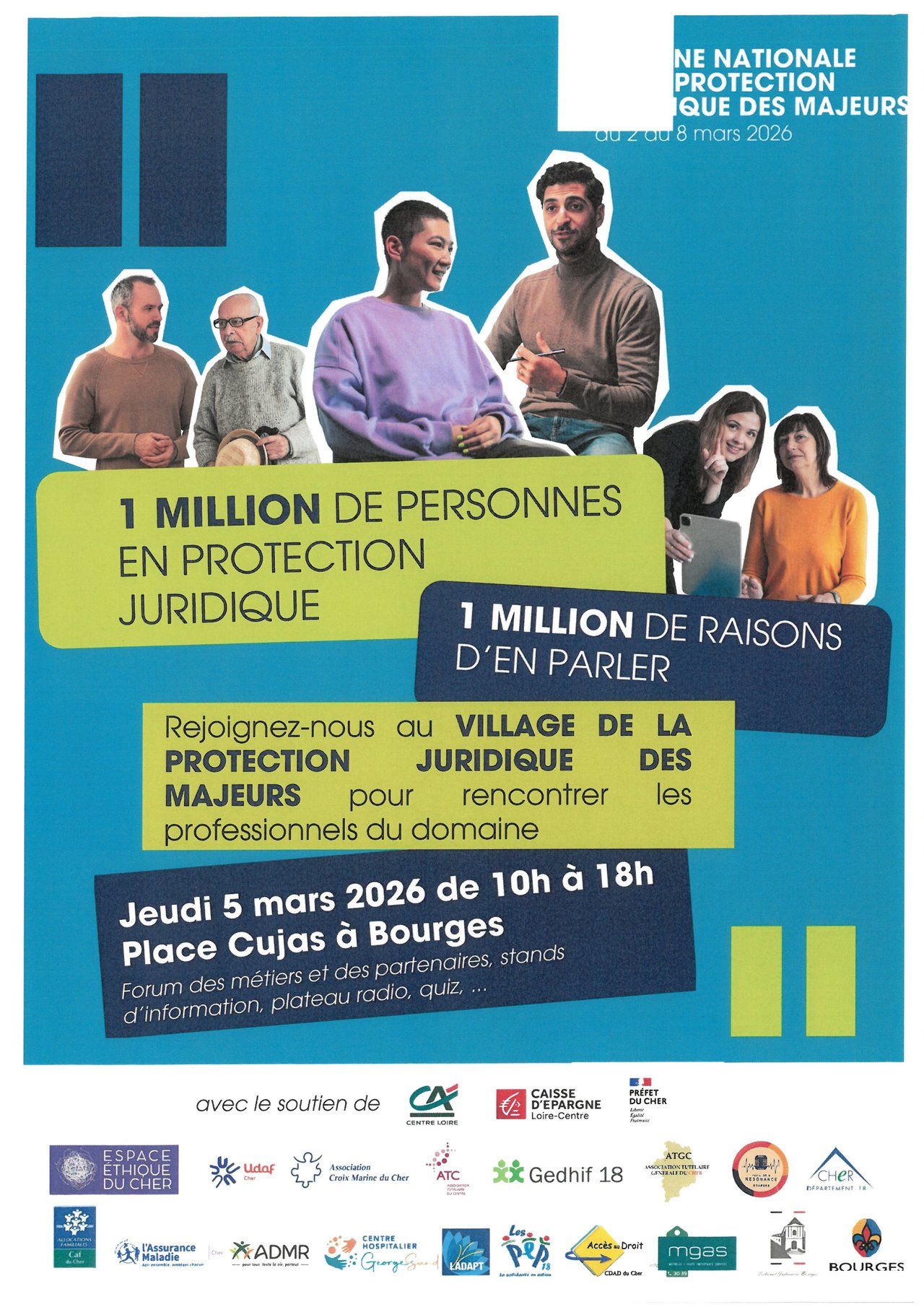 Dans le cadre de la Semaine Nationale de la Protection Juridique des Majeurs, l’Espace Éthique du Cher et ses partenaires organisent le Village de la Protection Juridique des Majeurs, le jeudi 5 mars 2026, de 10h à 18h, sur la Place Cujas à Bourges (accès libre et gratuit).