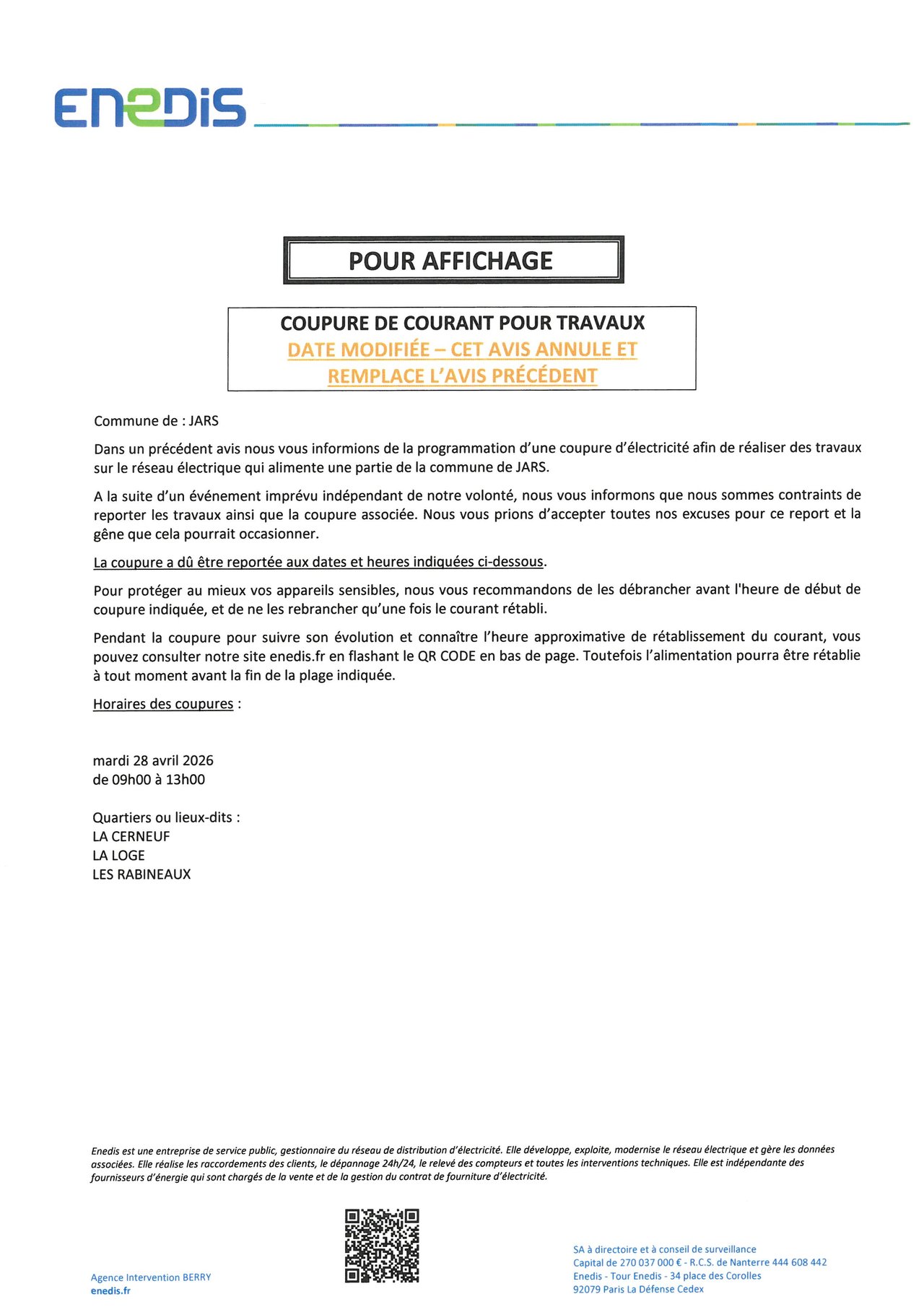COUPURE D'ÉLECTRICITÉ AU 28/04/2026 - JARS