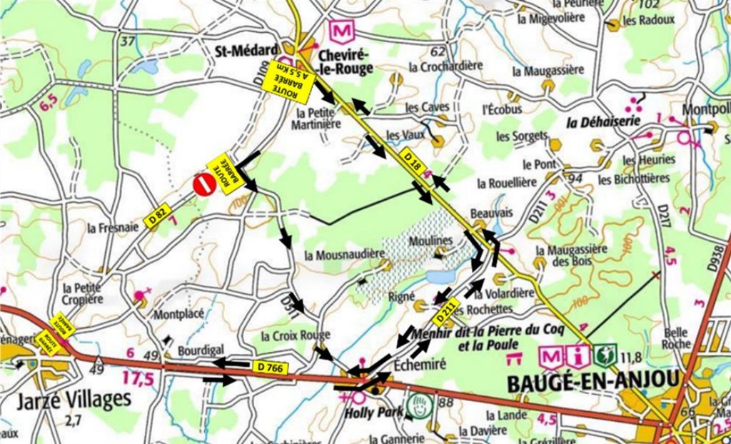 - Déviations : depuis Cheviré le Rouge, déviation par Echemiré et côté bourg de Jarzé déviation par l’entrée Est/Ouest de Jarzé (voir image n°2 ci-joint).