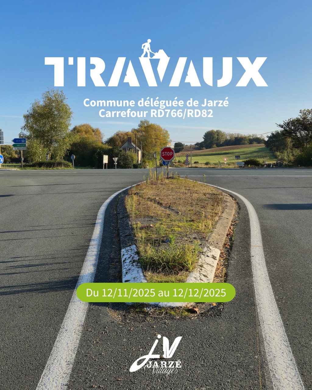 Du 12 novembre 2025 au 12 décembre 2025, des travaux auront lieu afin de créer un giratoire au carrefour RD766/RD82 (commune déléguée de Jarzé). Des panneaux seront posés sur site 15 jours avant le démarrage du chantier.