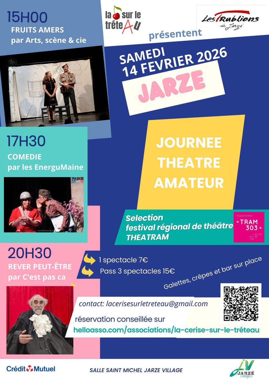 THEATRAM est un festival organisé par la fédération régionale des Troupes de Théâtre amateur en Pays de la Loire. Les troupes candidates participent aux rencontres de présélection, organisées dans plusieurs salles de la région. 8 à 9 compagnies seront ensuite retenues pour participer à la rencontre régionale qui se déroulera en mai 2026 à Varades (44), et qui désignera le représentant de la région à la finale nationale. Jarzé Villages accueille une journée de sélection, grâce au partenariat entre les Trublions de Jarzé et la Cerise sur le tréteau de Baugé. Bar et petite restauration sur place.