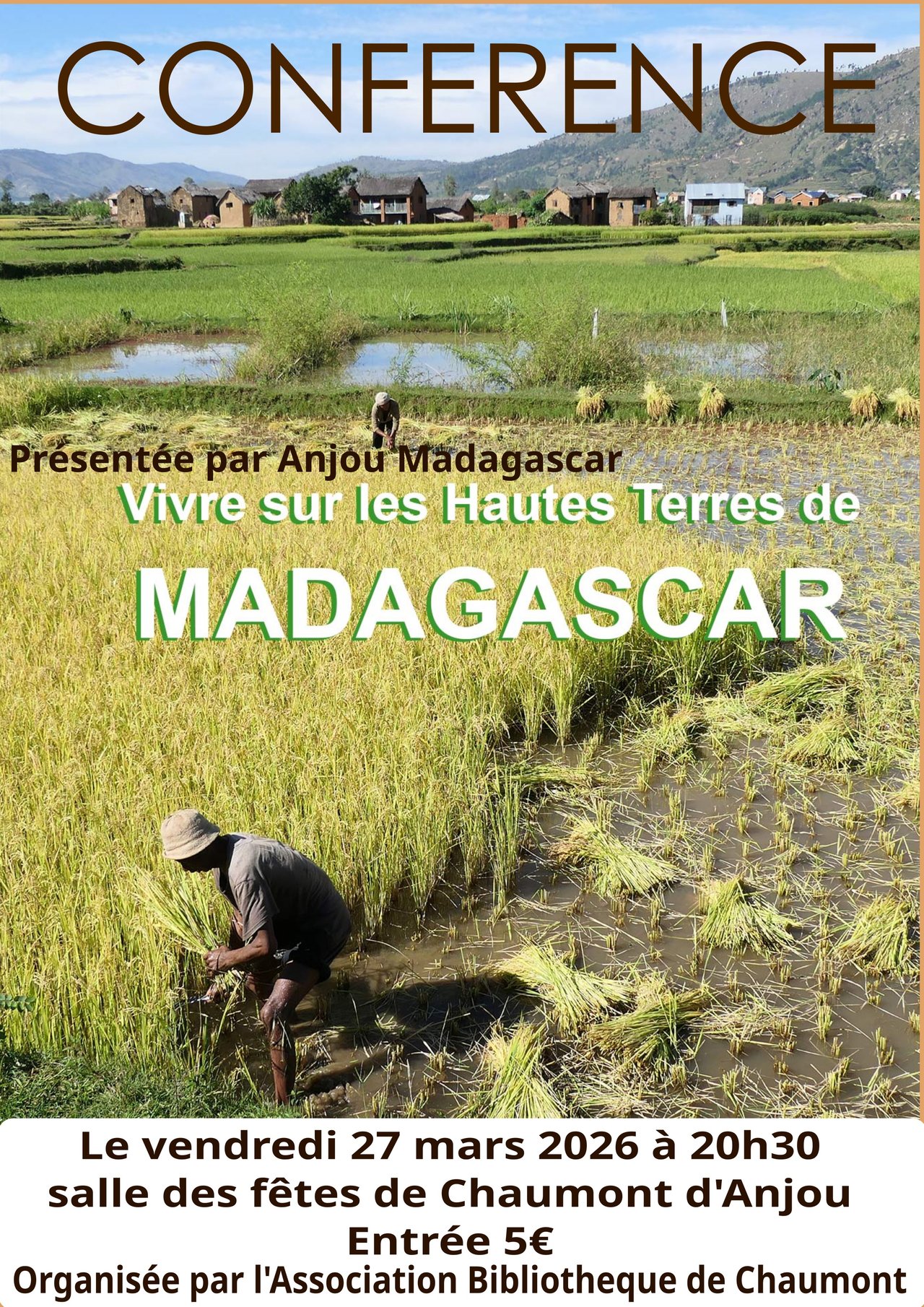 L'association de la Bibliothèque de Chaumont d'Anjou vous invite à participer à une conférence présentée par Jacques Labarre de l'Association "Anjou-Madagascar" salle des fêtes de Chaumont d'Anjou, vendredi 27 mars 2026 à 20h30