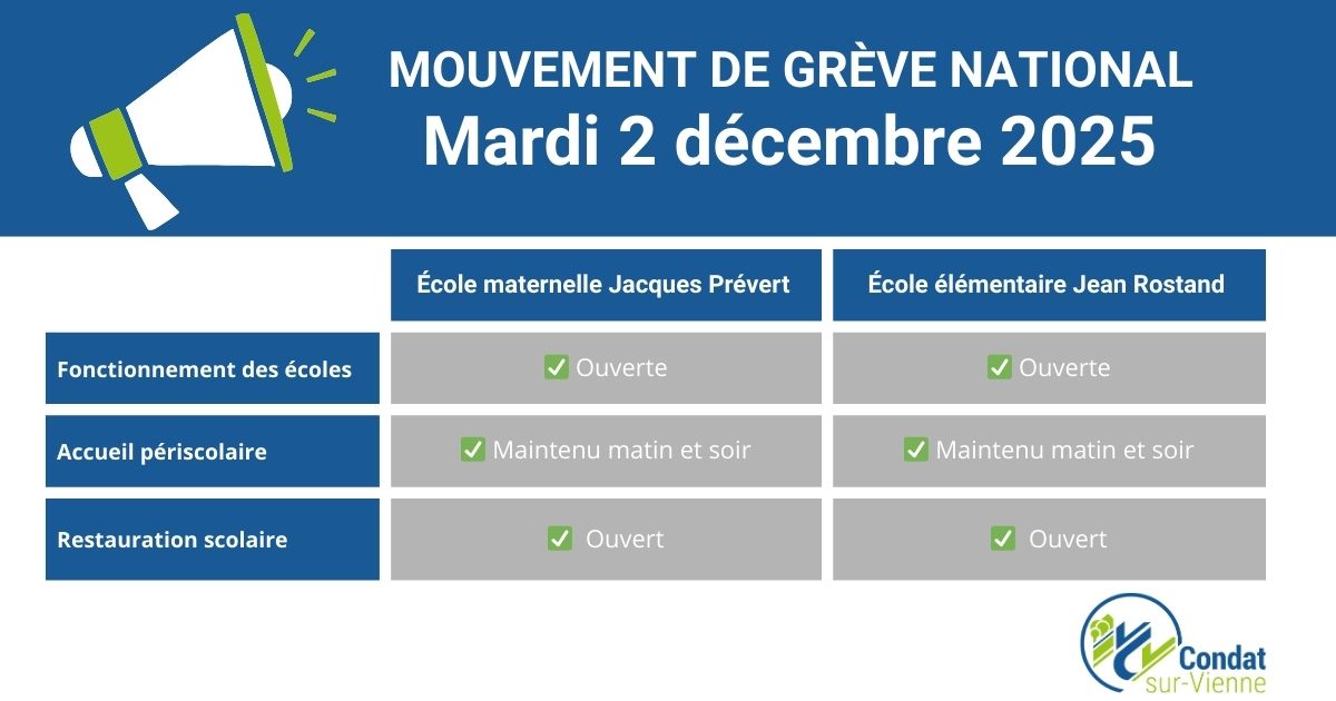 Aucune perturbation n’est prévue à Condat-sur-Vienne. Les écoles, la restauration et le périscolaire fonctionneront normalement.