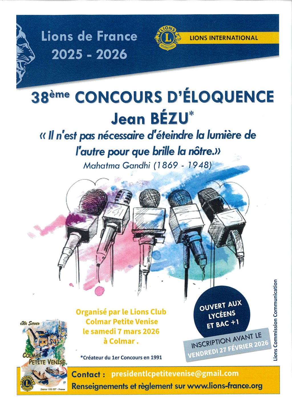 Le Lions Club Colmar Petite Venise est ravi de lancer l'appel à candidatures pour son prestigieux Concours d'Éloquence, l'événement qui célèbre la puissance des mots et des idées.