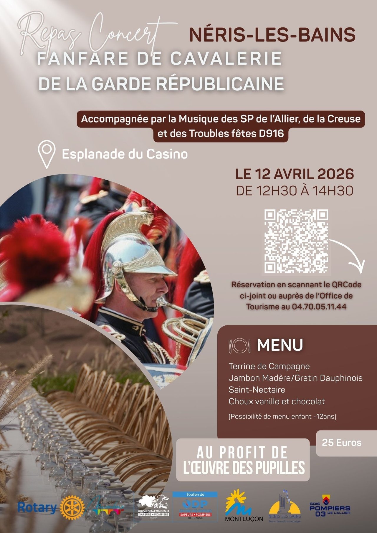- Dimanche 12 avril 2026 à 12h30 : Repas concert à Néris les Bains